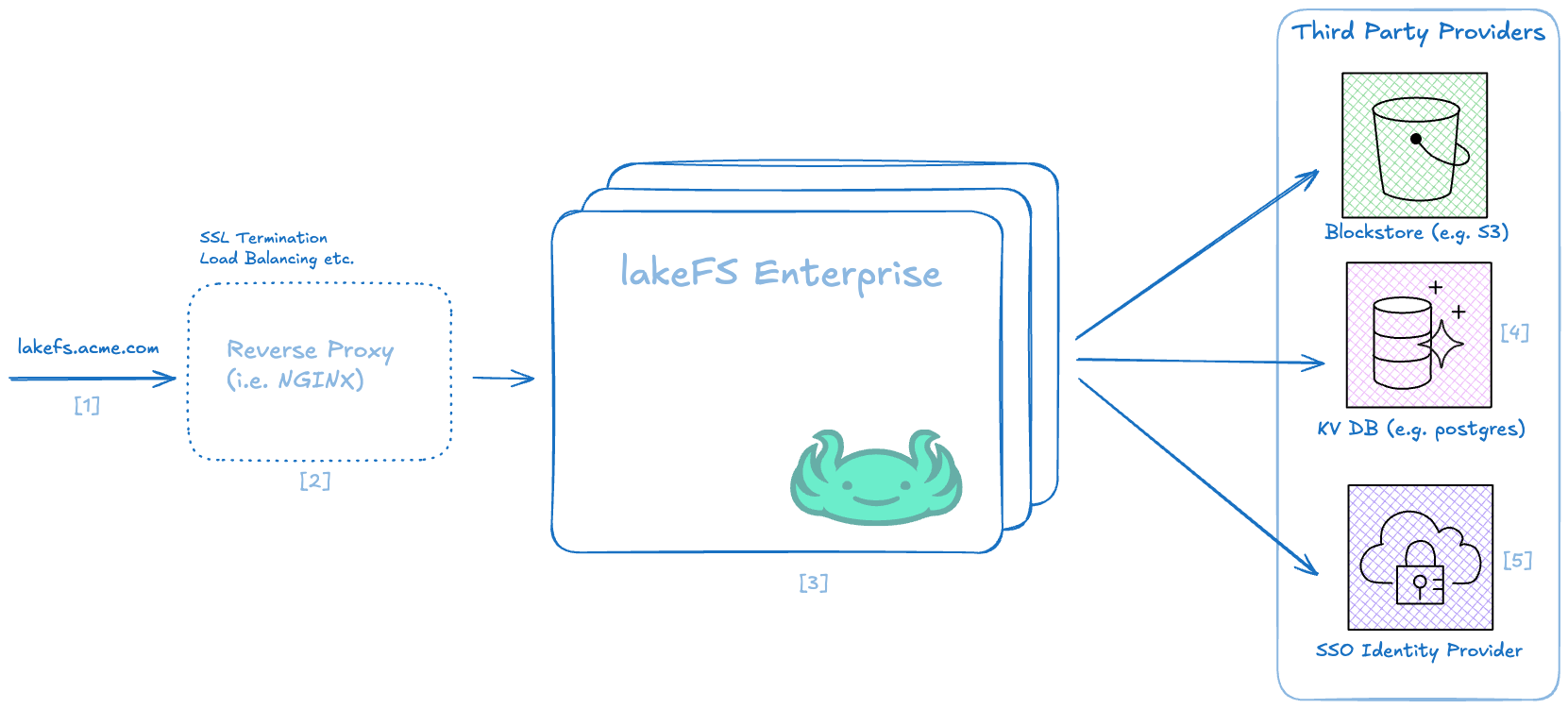 [2] A reverse proxy (e.g., NGINX, Traefik, Kubernetes Ingress, Load Balanacer) will distribute requests between lakeFS server instances, SSL termination etc. Required when using more than 1 lakeFS instance.